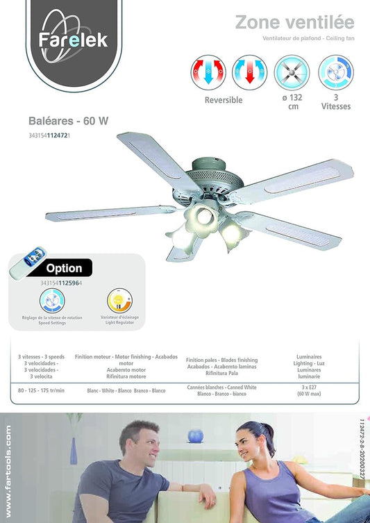 LuxiLamps - 5 Kop Bloem Plafondventilator - Dimbaar Met Afstandsbediening - E27 - 3 Snelheden - Wit - 132 cm - Slimme Ventilator