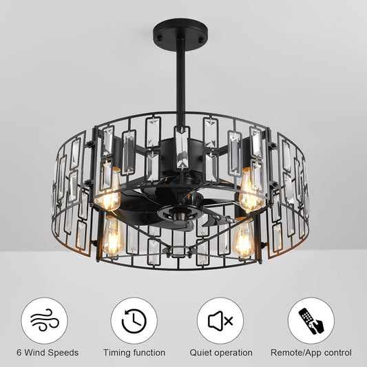 LuxiLamps - Moderne Kristallen Kooi Ventilator - Plafondventilator - 6 Standen - Zwart - 50 cm - Met Afstandsbediening - Kroonluchter Ventilator - Woonkamer Lamp