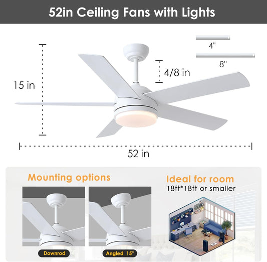 LuxiLamps - 5 Blad Plafondventilator - Moderne LED Ventilator - 3 Snelheden - Bedienbaar Met Afstandsbediening - 132 cm - Wit - Omkeerbare Bladen