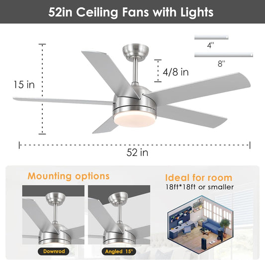 LuxiLamps - 5 Blad Plafondventilator - Moderne LED Ventilator - 3 Snelheden - Bedienbaar Met Afstandsbediening - 132 cm - Zilver - Slimme Ventilator