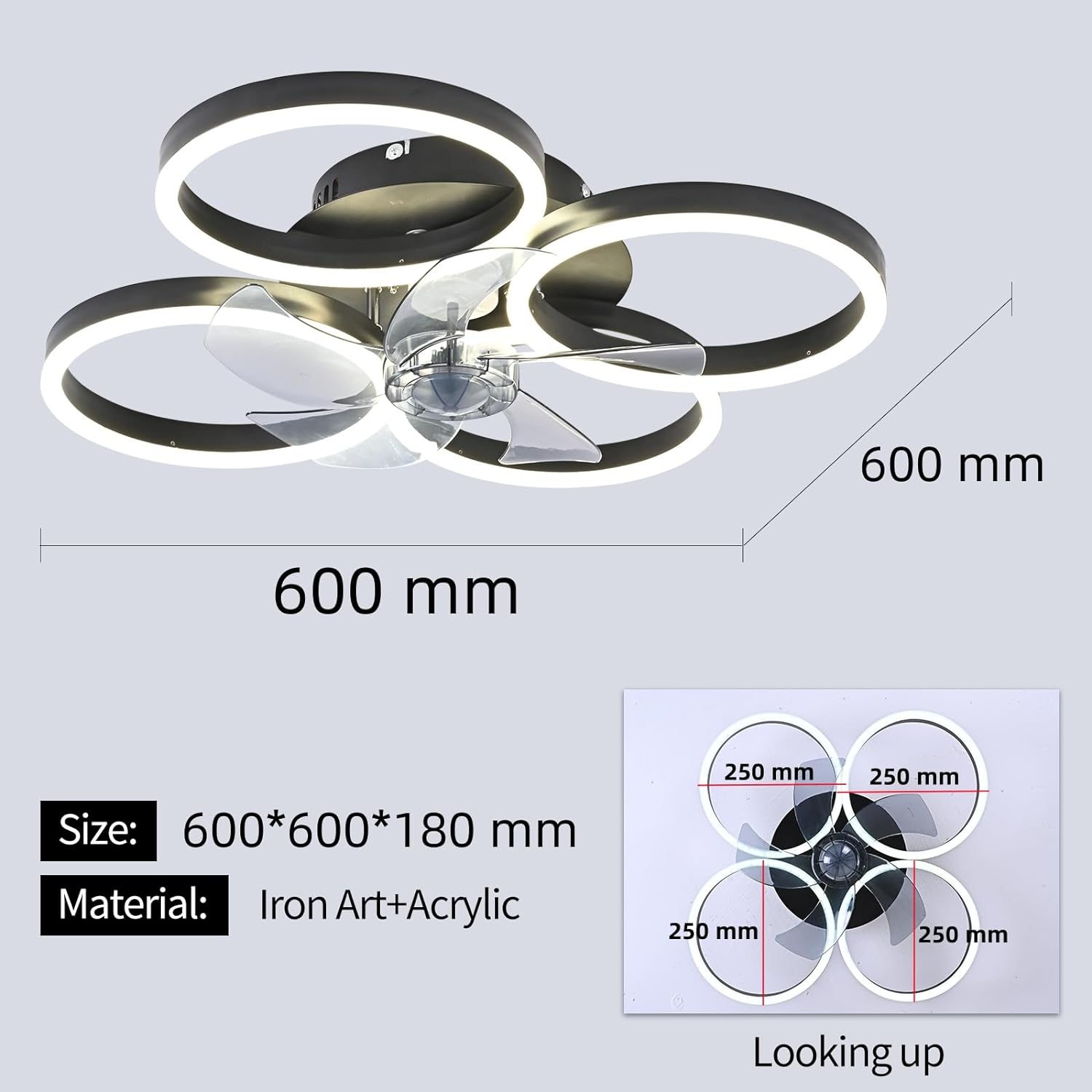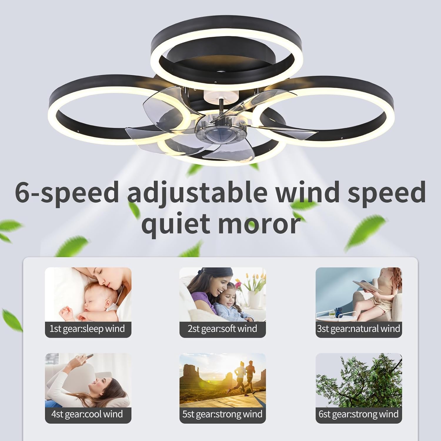 - De lamp wordt gecombineerd met een ventilator en een verlichtingsinstelling. Hij beschikt over afstandsbediening, bluetooth-app, dimmen, kleurtemperatuurinstelling, helderheidsinstelling, 6 snelheden windsnelheidsinstelling, slaapmodus, ventilator vooruit- en terugloopfunctie (zomer-wintermodus), en timerfunctie, plafondventilator met verlichting en afstandsbediening stil