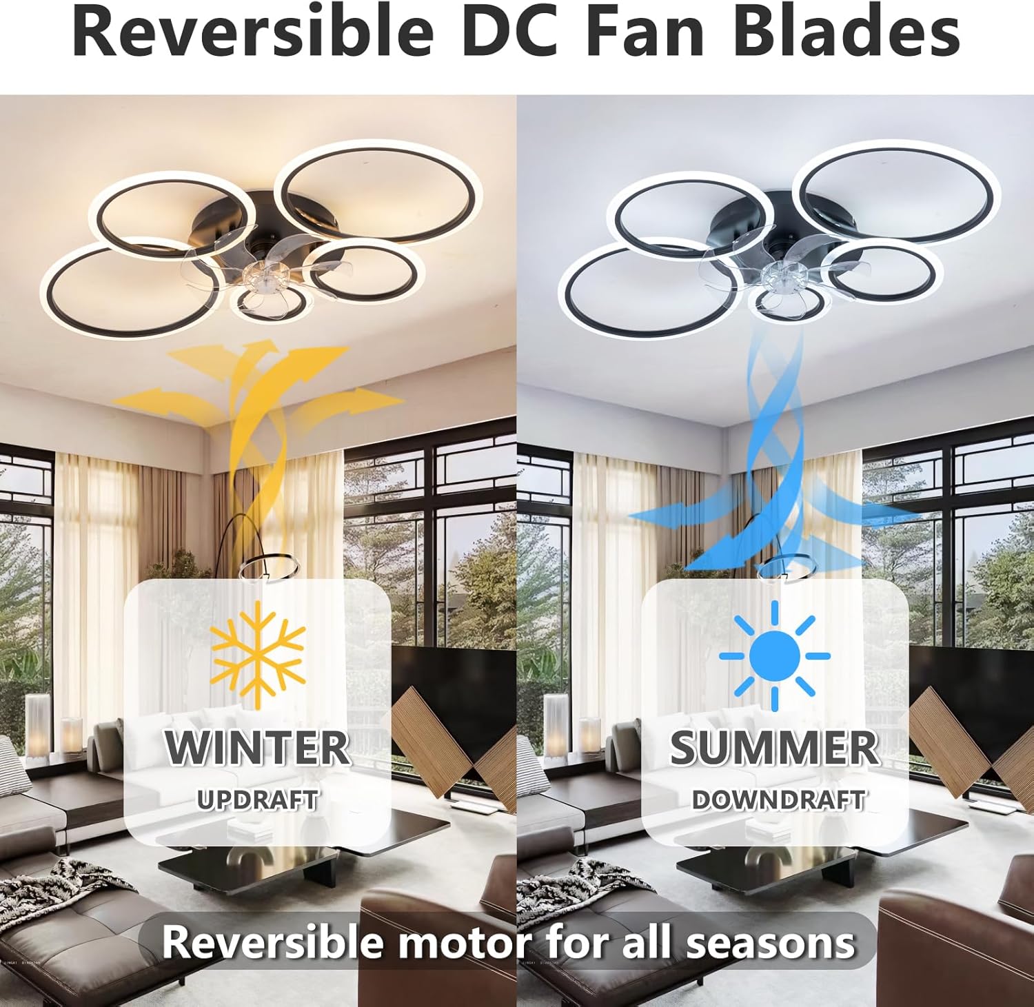 LuxiLamps - 5 Rings Ceiling Fan - Black - 6 Speeds - Dimmable With Remote Control and APP - Modern Circle Fan Light