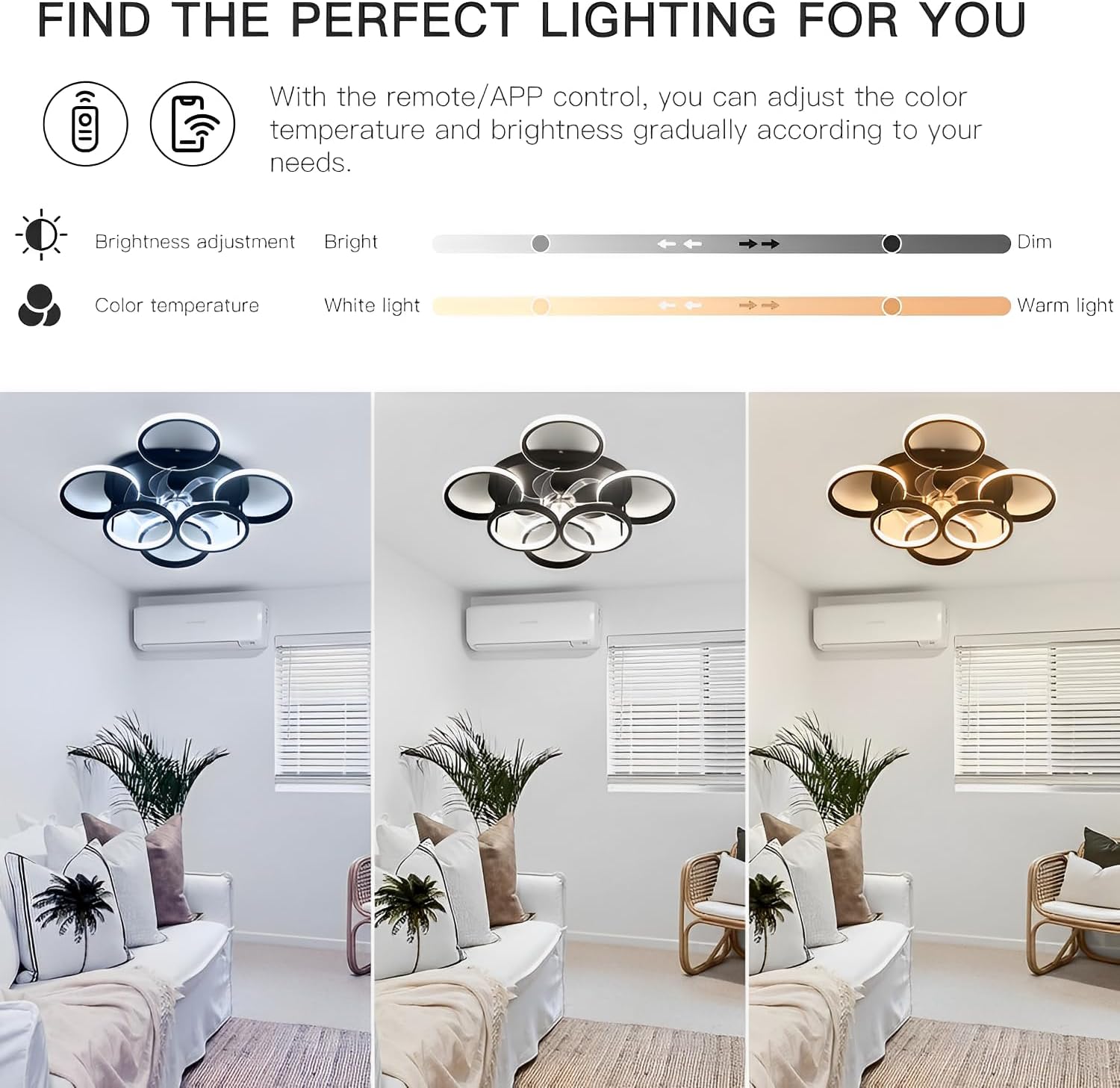 - Intelligente LED-lichtbron: plafondventilatoren met verlichting maken gebruik van de nieuwe LED-lenslichtbron, acryl oogbeschermlampenkap. De plafondventilator met afstandsbediening en bluetooth-app kan traploos van kleurtemperaturen worden ingesteld (3000 K - 6500 K) en helderheid, de led-ventilator heeft zacht licht, geen verblinding, geen hoge frequentie-storingen, geen flikkering, beschermt je ogen. Bovendien beschikt de ventilator met licht bovendien over een geheugenfunctie