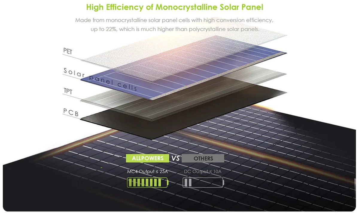 ▶Hoge efficiëntie: 100W zonnecel is gemaakt van VS, tot 22% efficiëntie, biedt eindeloos plezier voor laptop, energiecentrale, mobiele telefoon en andere batterij onder de zon