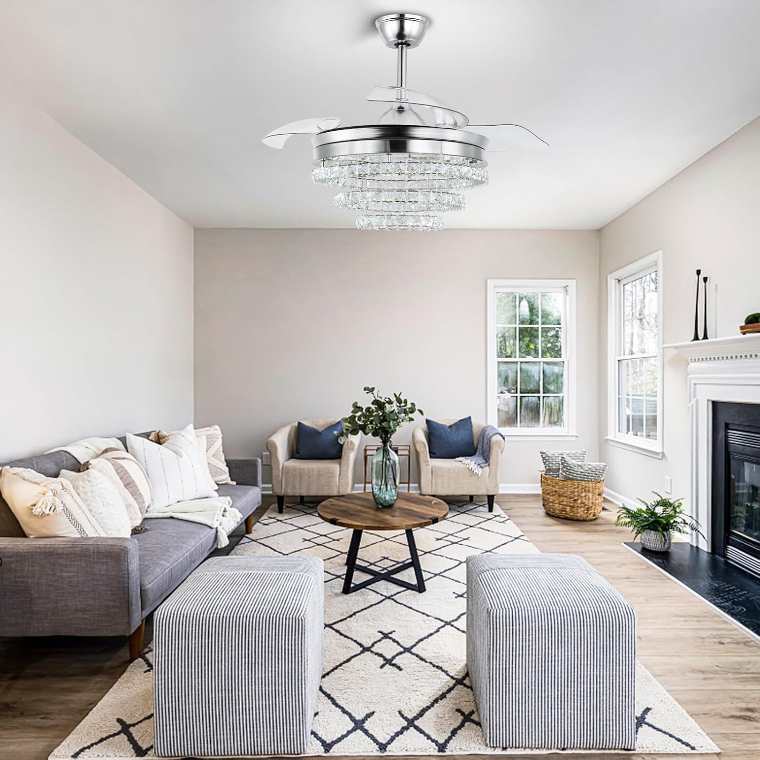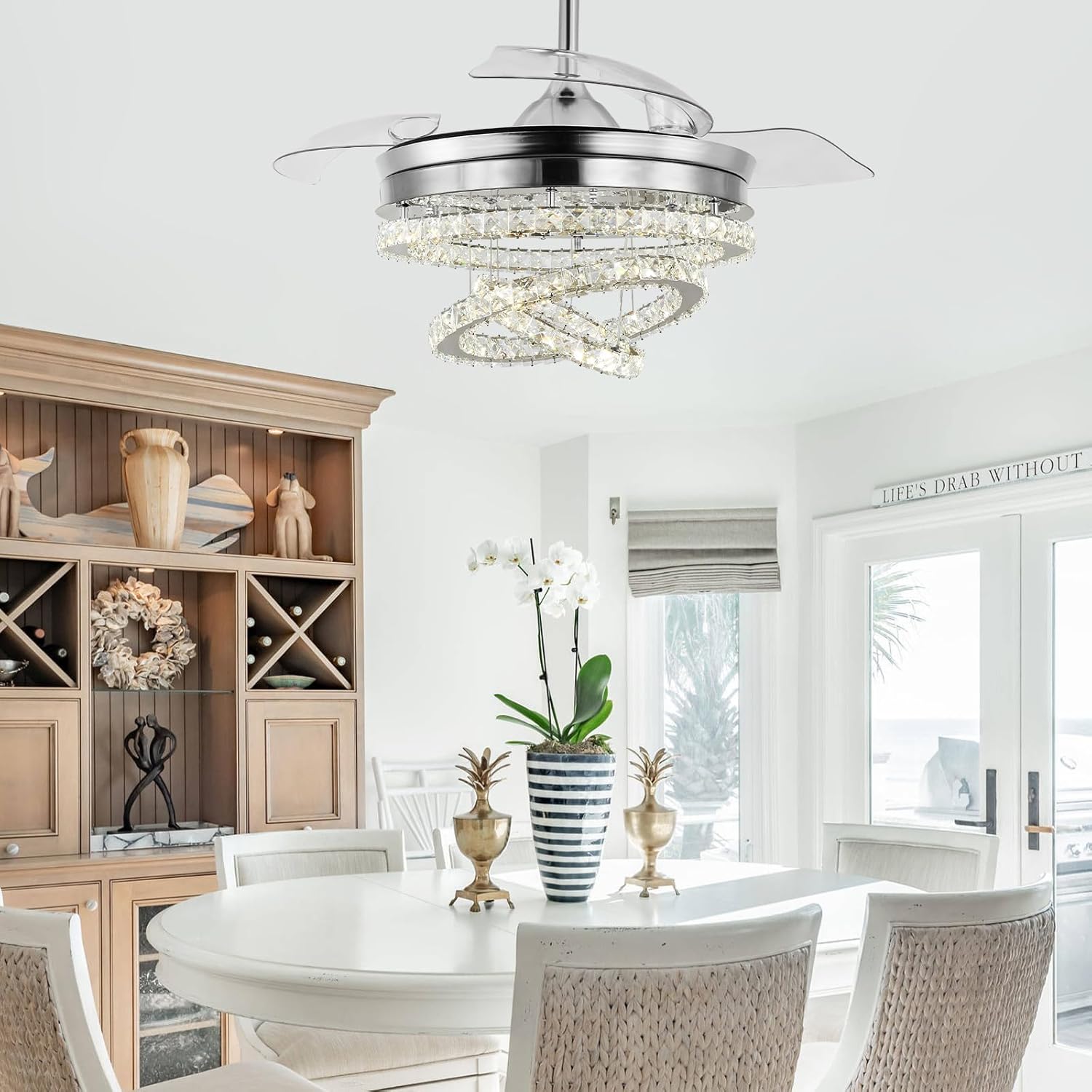 Kristallen plafondventilator: intrekbare acrylbladen, 3-in-1 ledverlichting, ingebouwde ledchips. Kleur: koel wit, neutraal wit en warm wit. Met geheugenfunctie voor de verlichting.