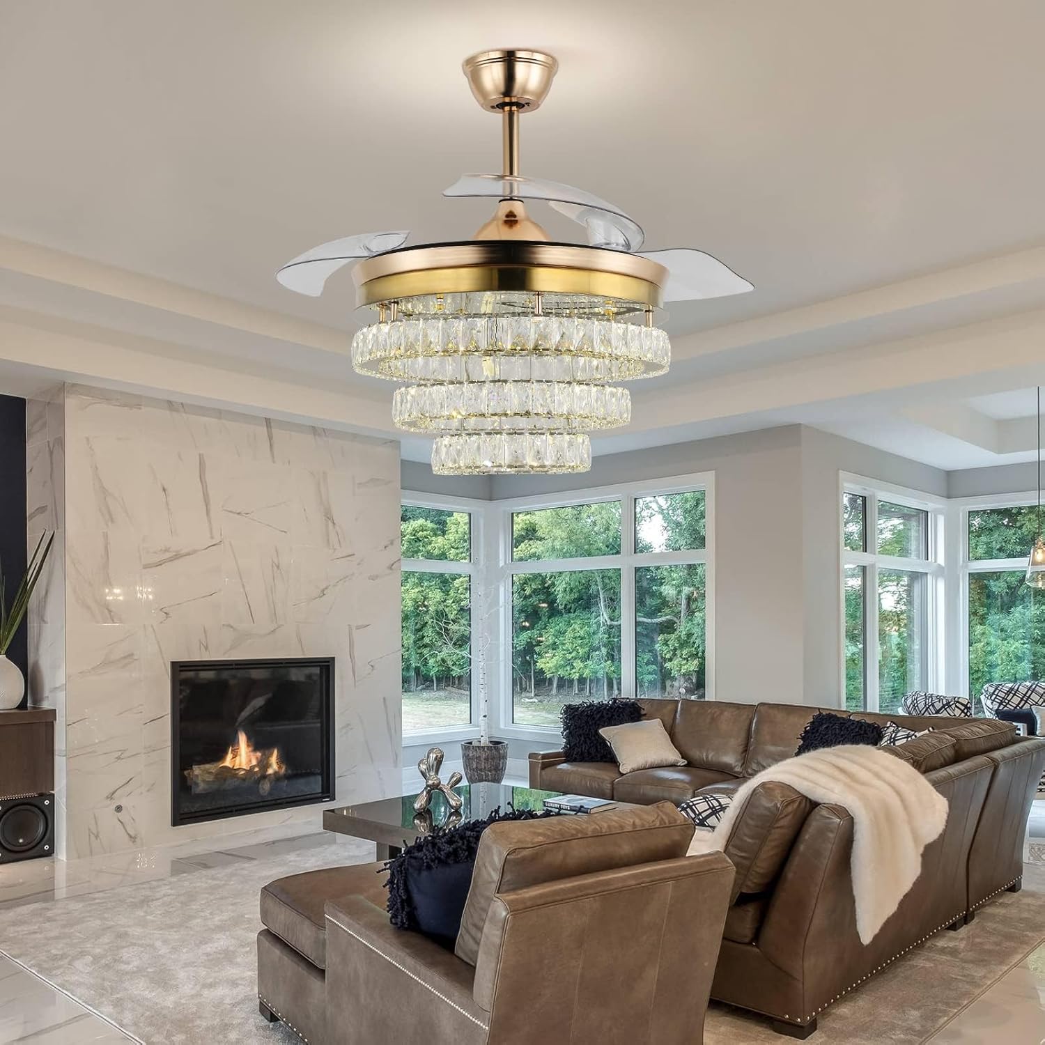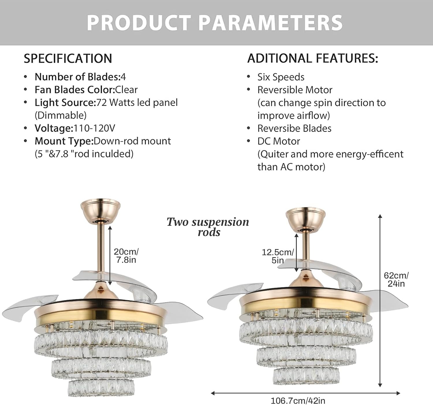 42-zoI plafondventilator met verlichting: geschikt voor ALLE seizoenen: met afstandsbediening voor de omgekeerde motor, voorwaartse stand in de zomer, omgekeerde stand in de winter, bevordert de luchtstroom. Plafondventilator met verlichting. Materiaal: ijzer + groot kristal + ABS (trekkende bladen).