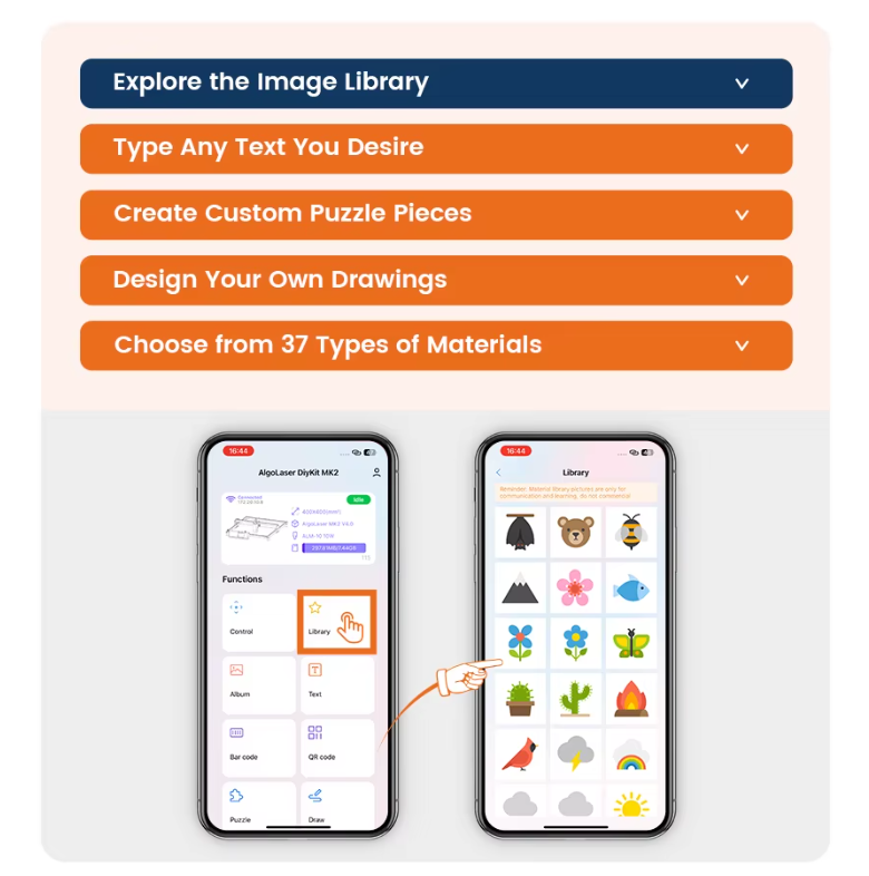 Ondersteuning van APP en offline graverenMaak op uw manier verbinding met de AlgoLaser DIY KIT MK2 10W lasergraveer- en snijmachine! Of het nu via USB, TF-kaart, WiFi of app is, de keuze is aan jou.Ga online of neem het offline, het is allemaal aan jou.En dankzij de compatibiliteit met professionele graveersoftware zoals LaserGRBLand LightBurn kunt u de software kiezen die bij uw stijl past!