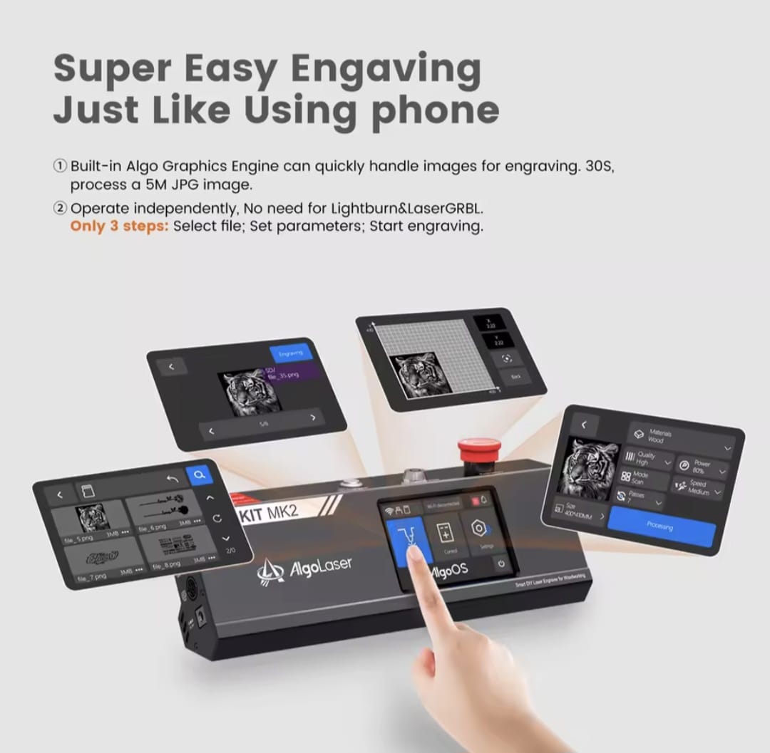 Originele beeldgraveren en origineel SVG-snijden:De AlgoOS heeft een ingebouwde Algo Graphics Engine. Een 5M JPG-beeld kan binnen 30 seconden worden verwerkt, van afbeelding tot gravure binnen 1 minuut, waardoor gewone gebruikers vrij kunnen zijn van het leren van nieuwe software.