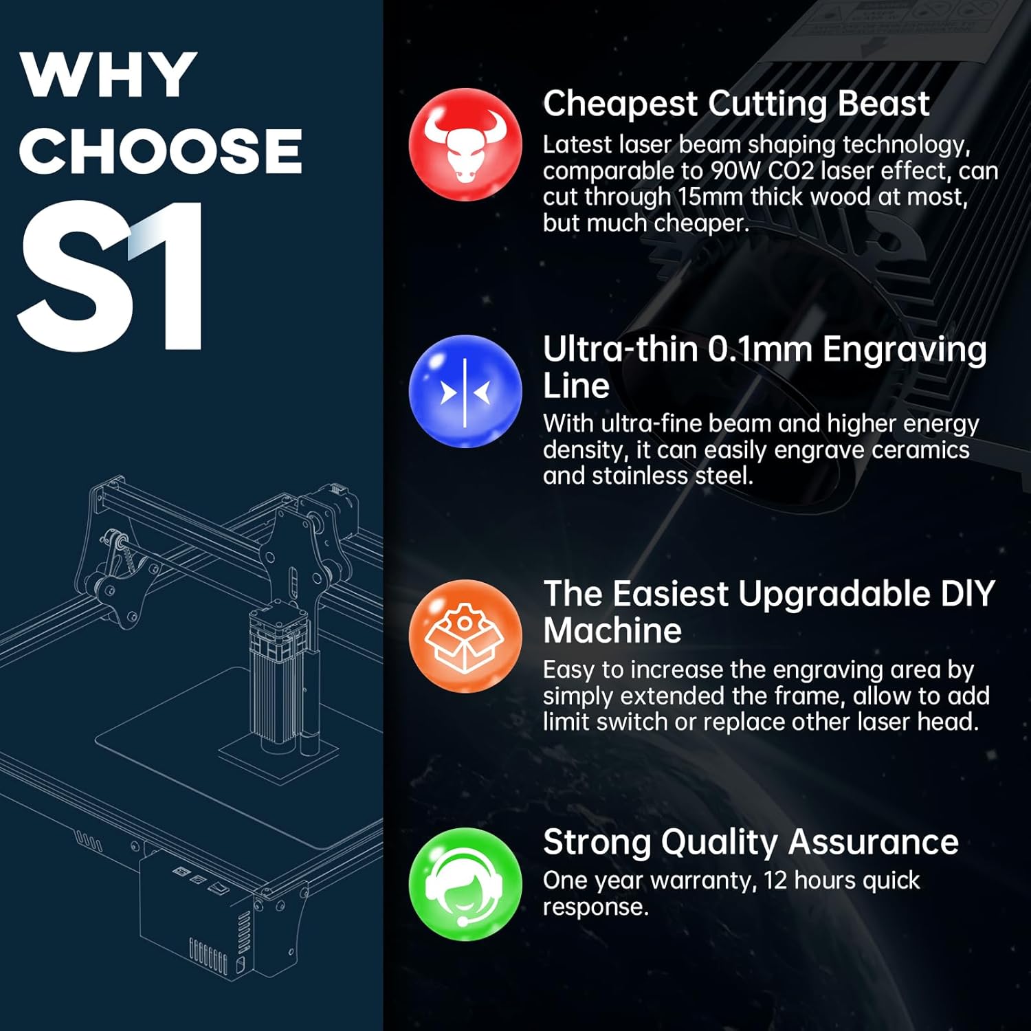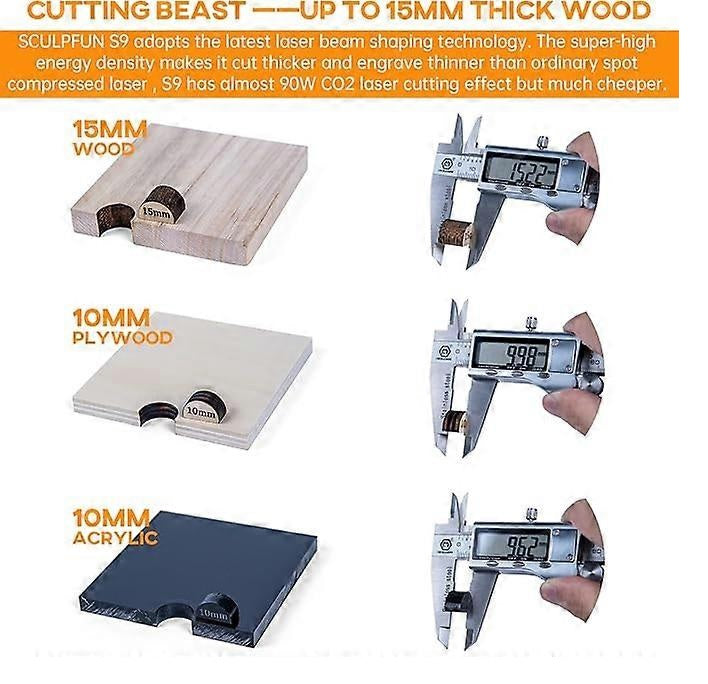 Laserstraalvormingstechnologie: S1 maakt gebruik van de nieuwste 5.5W laservormingstechnologie diodelaser, het heeft een ultrafijne 0.06 mm laserfocus, met supersnijpenetratie en fijnheid, de dikste kan 15 mm dik hout, 10 mm acryl, gesneden keramiek en roestvrij staal snijden.