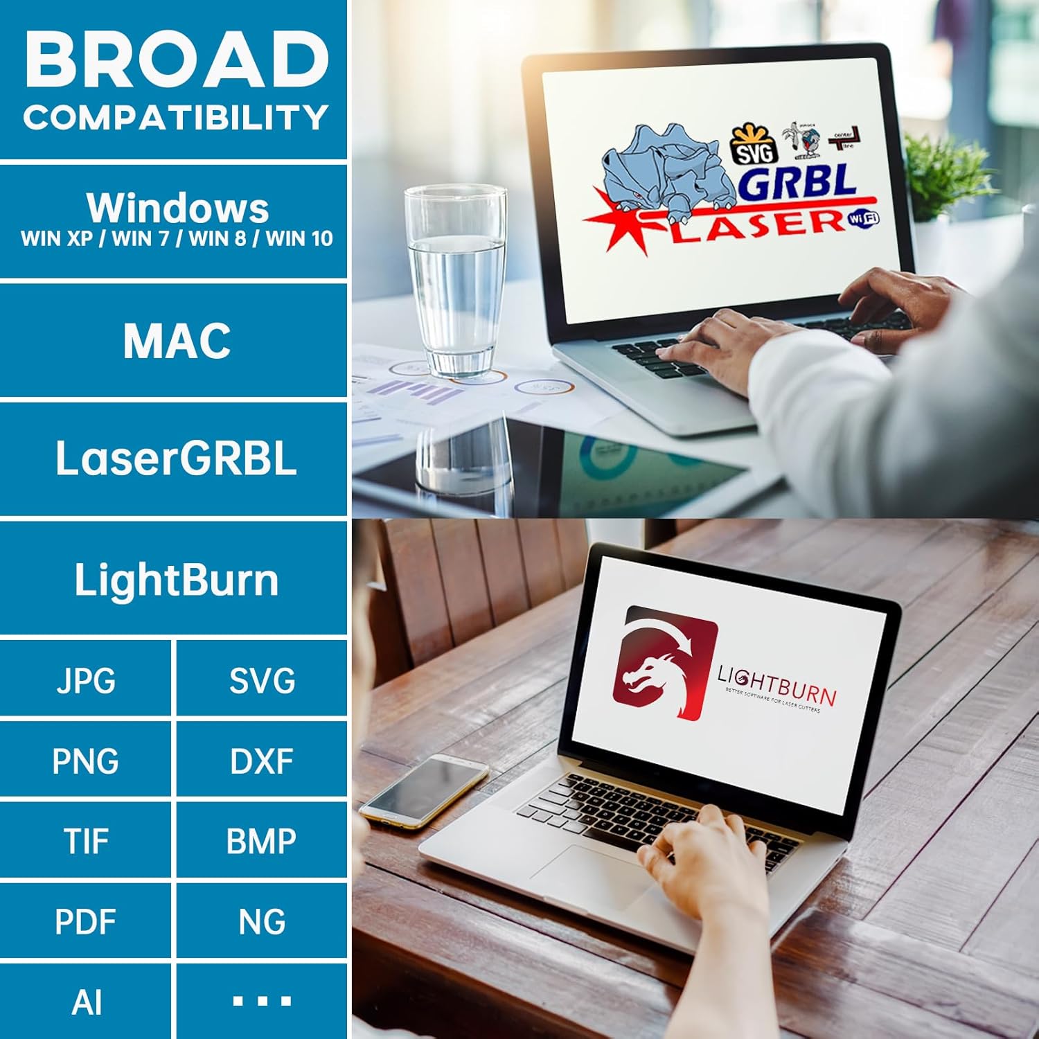 Uitgebreide compatibiliteit: de machine is compatibel met verschillende volwassen graveersoftware, zoals voor LaserGRBL, voor LightBurn, voor Benbox, voor GrblController, voor LiteFire, ondersteunt graveren in de PWM-modus, ondersteunt Windows-systeem, MAC-systeem (LightBurn) en graveerbestandsformaat Ondersteuning JPG, PNG, DXF, SVG, G-code, NC, BMP, enz.