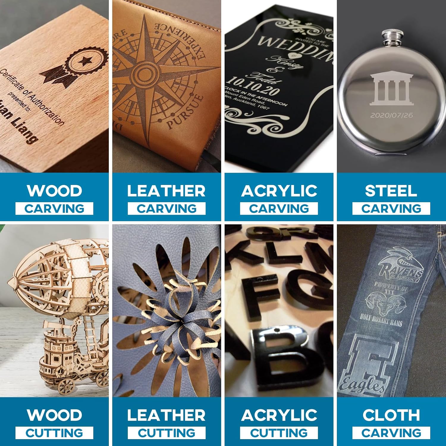 Graveermateriaal: hout, bamboe, karton, kunststof, leer, PCB, aluminiumoxide, roestvrij staal 304, keramiek, donkere steen.