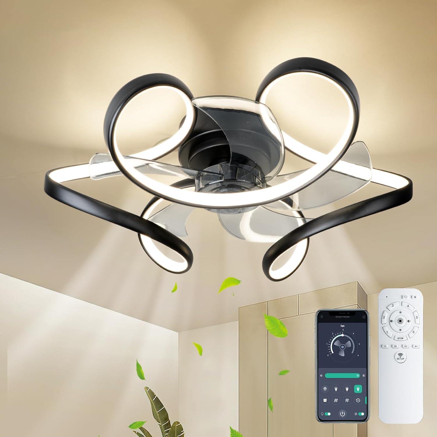 LuxiLamps - Krullen Ventilator Plafondlamp - Plafondventilator 50 cm - Zwart - Smart Lamp - Met Dimmer - 6 Standen Ventilator - Keuken Lamp - Woonkamer Lamp - Moderne Lamp - Slaapkamer Lamp Ventilator